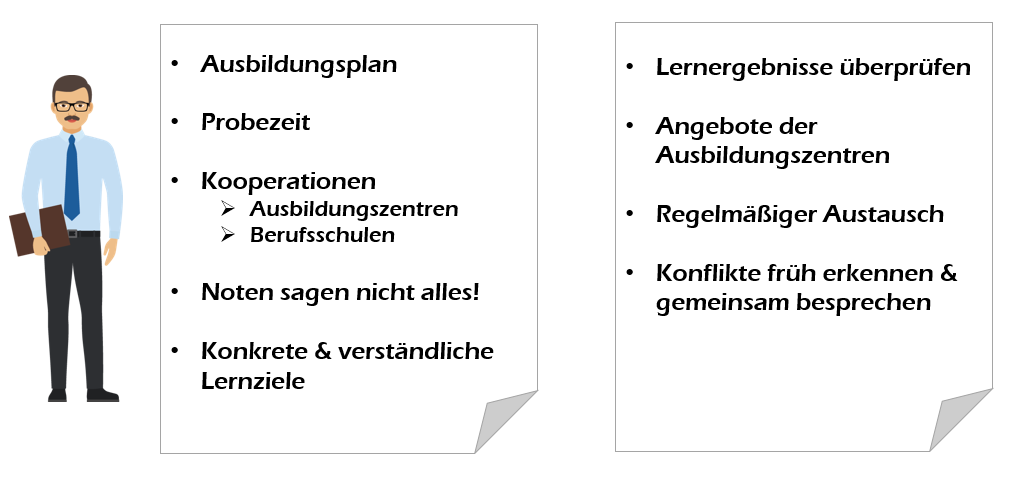 Ermöglichen Sie den Erwerb zusätzlicher Qualifikationen schon im Rahmen der Ausbildung und nutzen Sie dazu die Angebote der Berufsschulen (z. B. zum Erwerb von Schulabschlüssen) sowie der Ausbildungszentren (zusätzliche Befähigungsscheine und berufliche (Zusatz-) Qualifikationen).